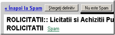 DACA MESAJELE DE LA NOI AJUNG DIRECT IN FOLDERUL DE SPAM, logati-va in contul d-voastra de gmail, si deschizand mesajul de la ROLICITATII nu trebuie decit sa apsati butonul "NU ESTE SPAM / NOT A SPAM" (subliniat in imaginea de mai jos).Pentru orice intrebari, sugestii sau HELP on line va rugam sa ne contactati imediat